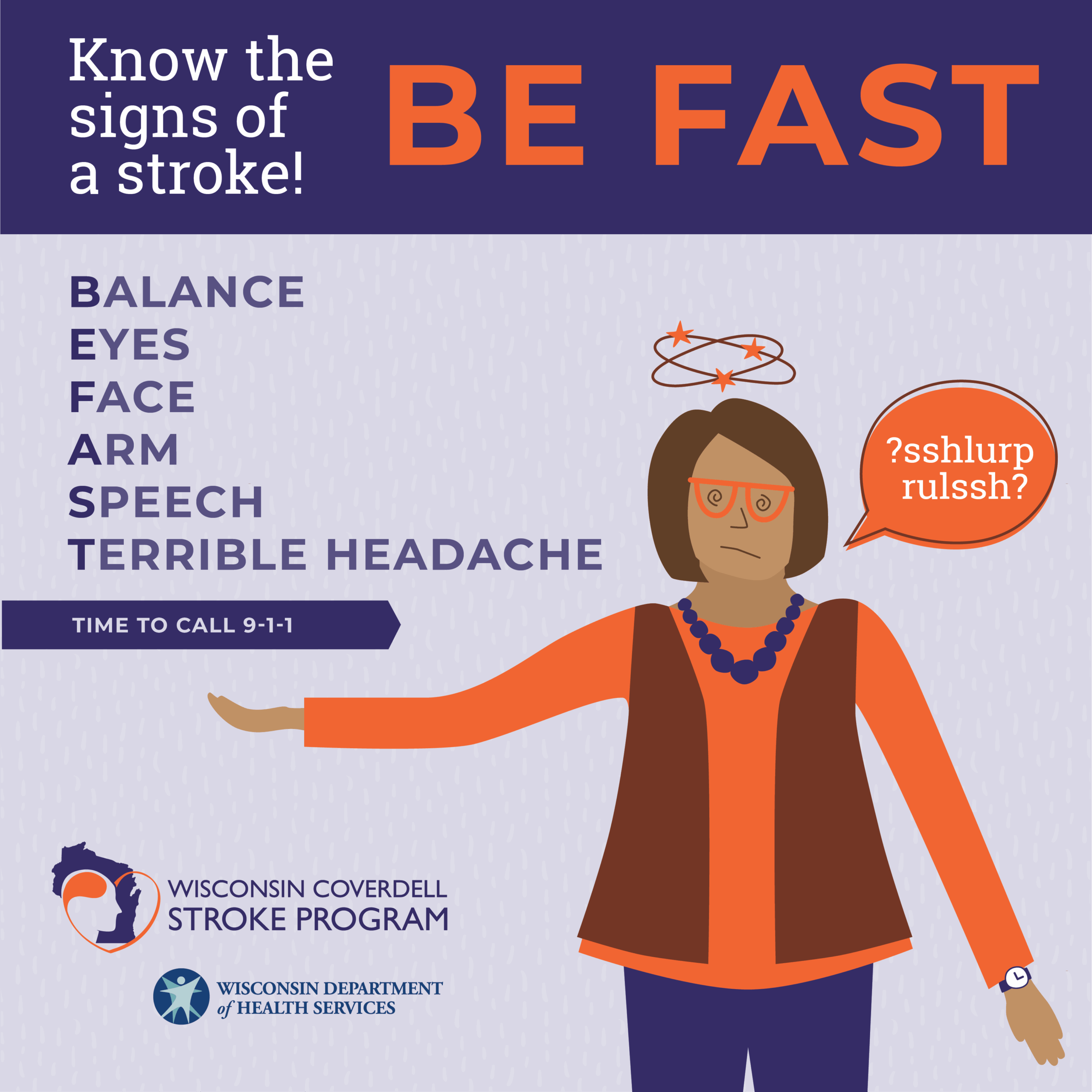 To learn more about recognizing and responding to stroke symptoms, visit Wisconsin Coverdell Stroke Program: BE FAST | Wisconsin Department of Health Services or contact your local health department.