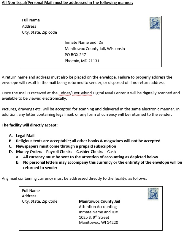 ALL correspondences are scanned by Manitowoc County Jail staff before transmission is complete. If a correspondence is flagged (contains questionable verbiage/ content), it will be denied.