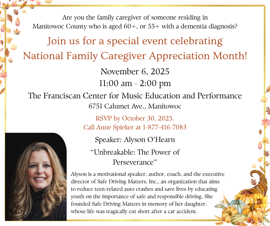 Enjoy a catered lunch, a wonderful speech by Alyson O’Hearn, and the company of other Manitowoc County family caregivers in the beautiful venue of the Franciscan Center.